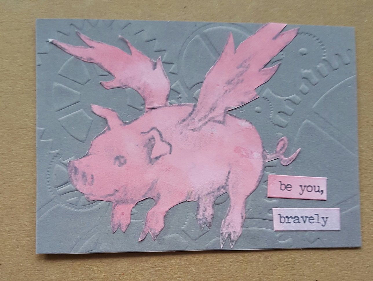 I printed a flying pig image, which I absolutely love so keep it safe in my file!! I water coloured the printout and then, once it was dry, fussy cut out the image. I attached it to one of the grey pieces of card and then added some Tim Holtz words - watercoloured to match.